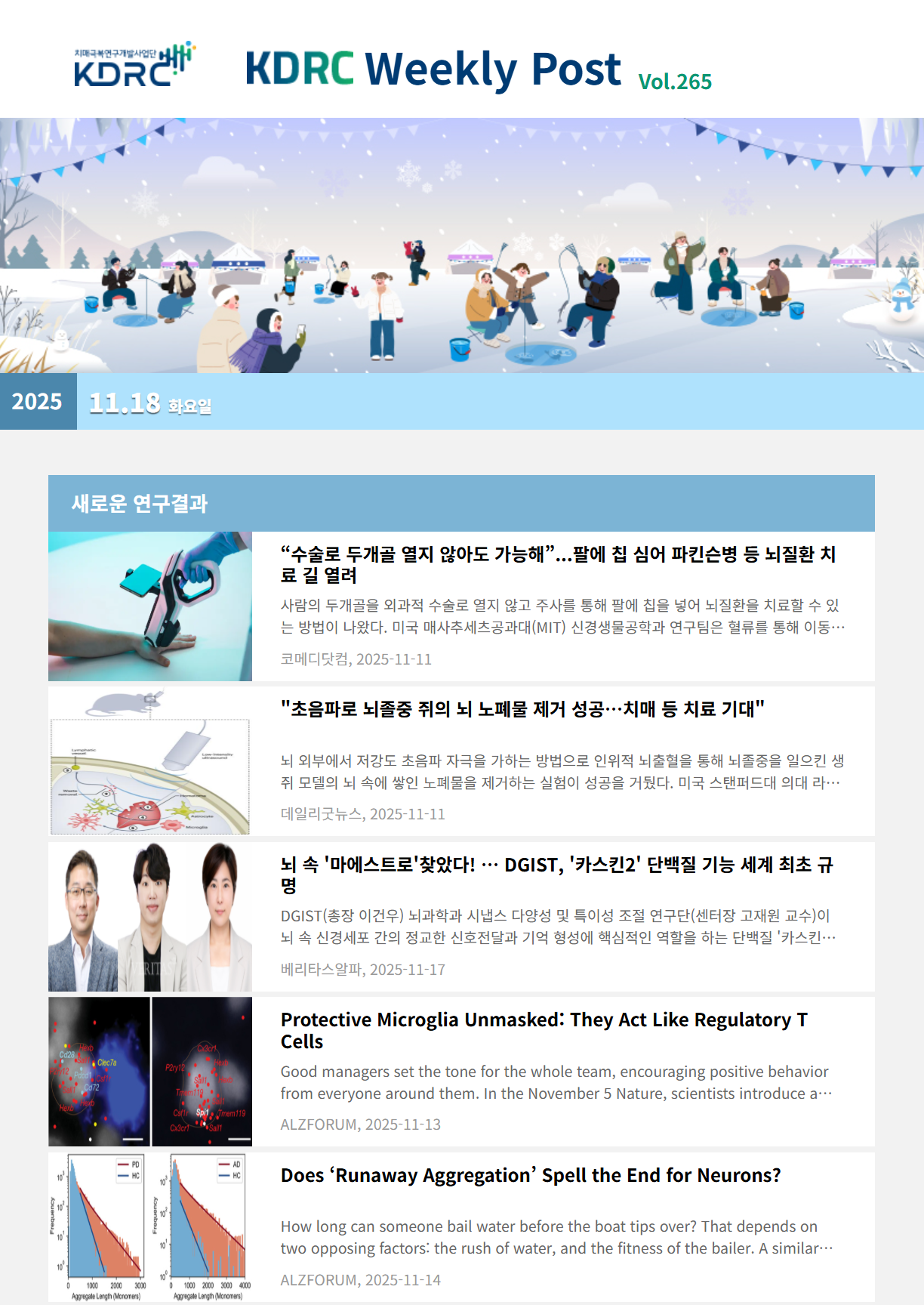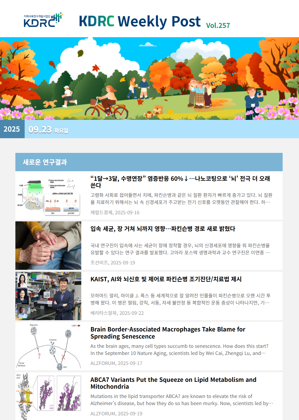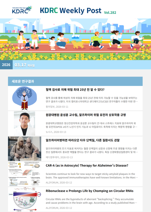 새로운 연구 결과, 과학기술 · 산업, 오피니언, 정책 · 학회 소식의 4개 영역으로 이루어져 있으며 치매극복연구개발사업단과 관련된 다양한 뉴스를 전달해 드립니다.