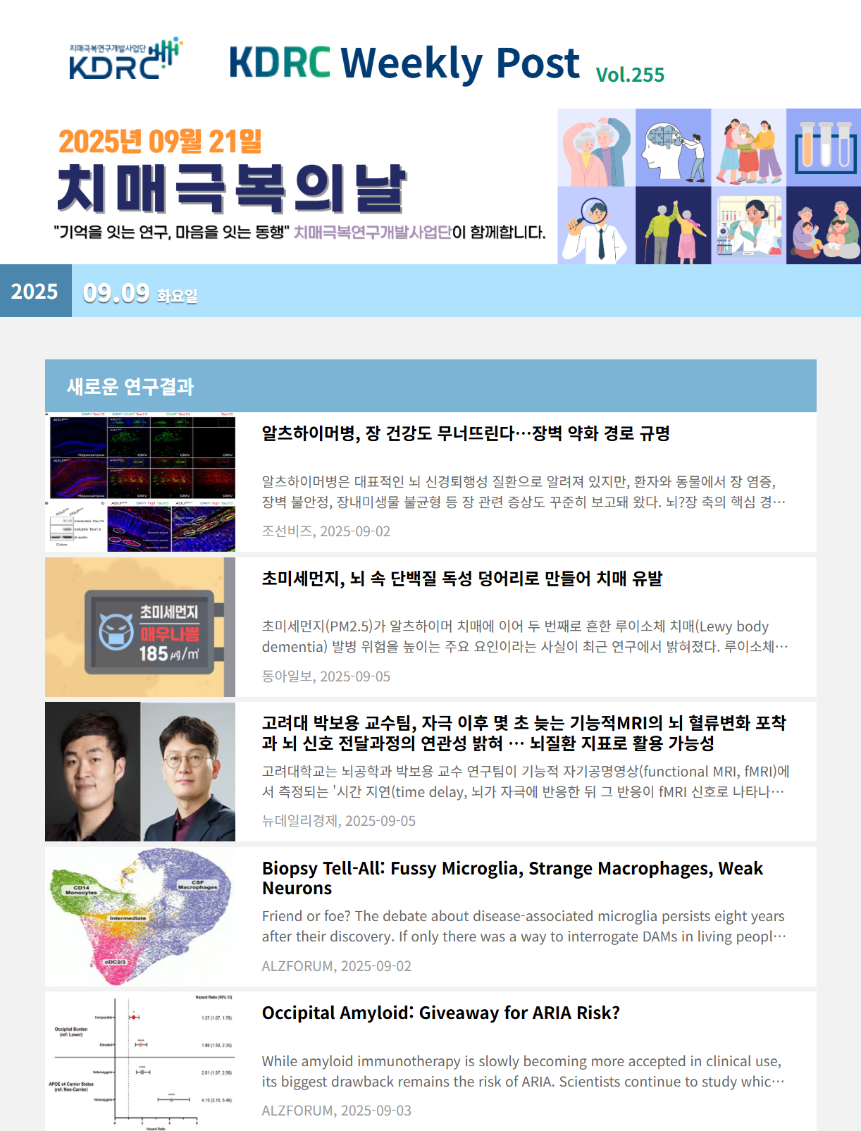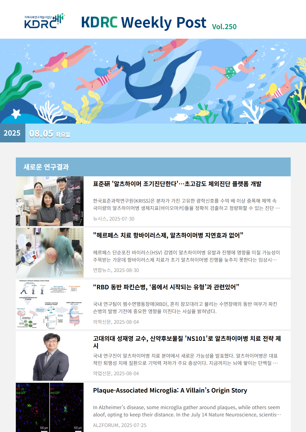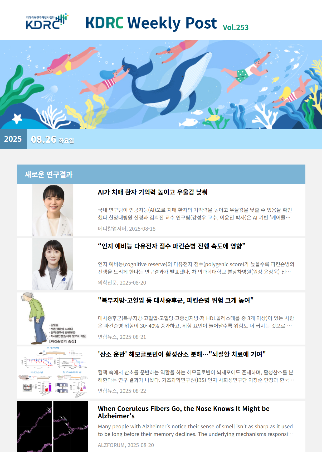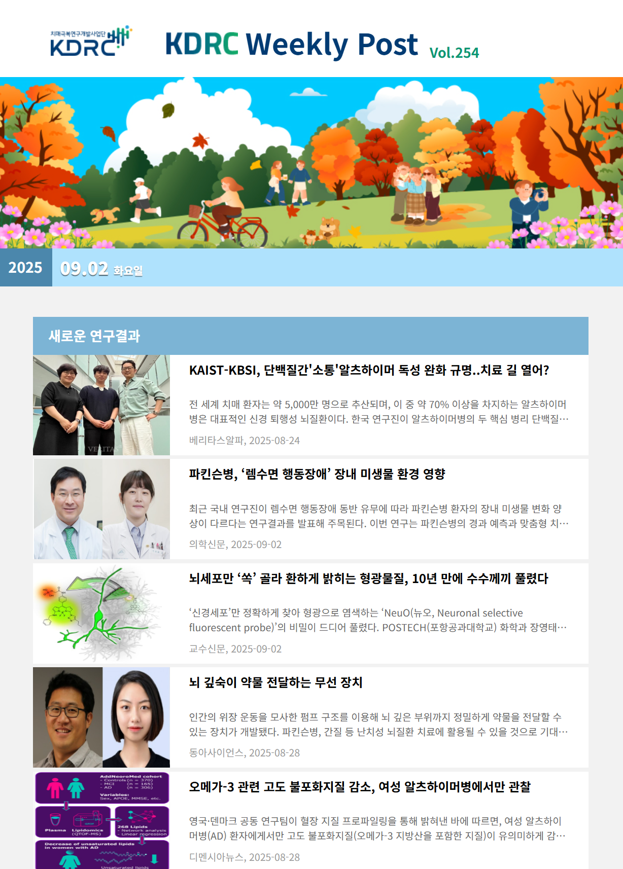 새로운 연구 결과, 과학기술 · 산업, 오피니언, 정책 · 학회 소식의 4개 영역으로 이루어져 있으며 치매극복연구개발사업단과 관련된 다양한 뉴스를 전달해 드립니다.