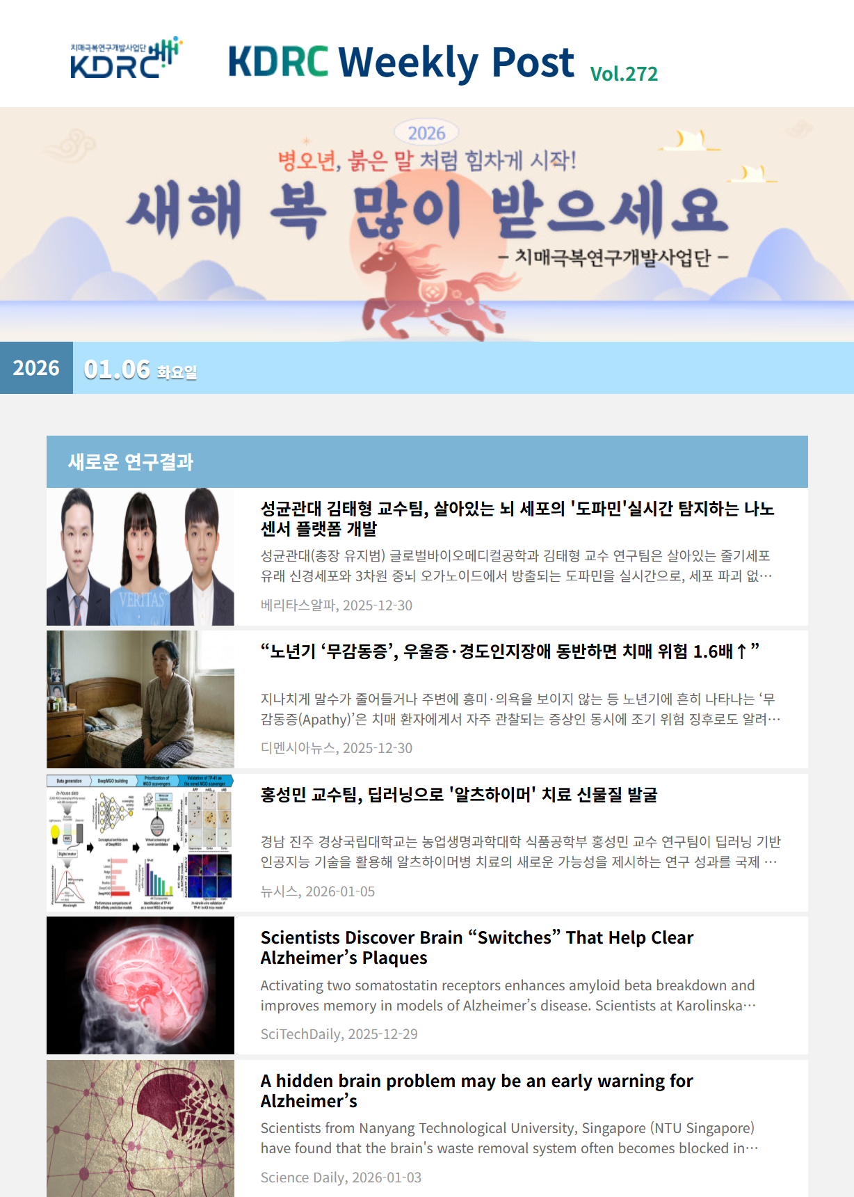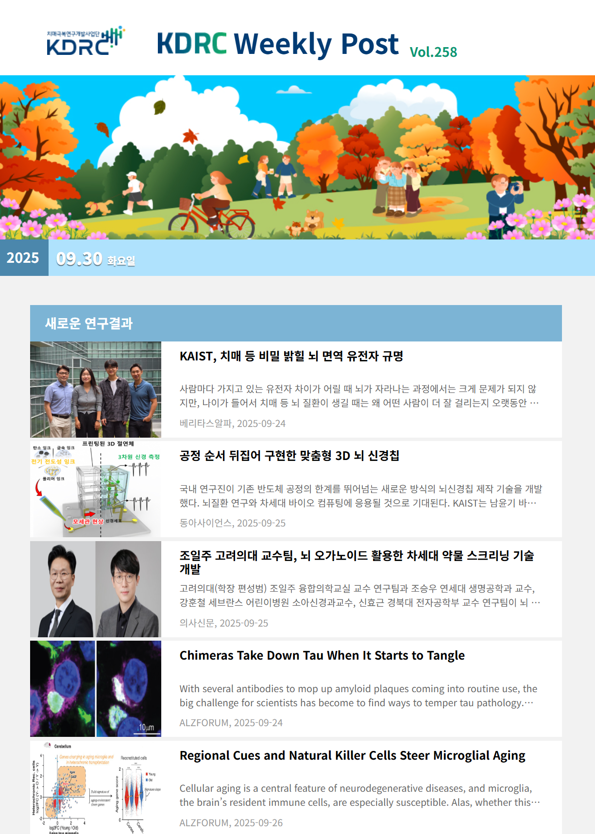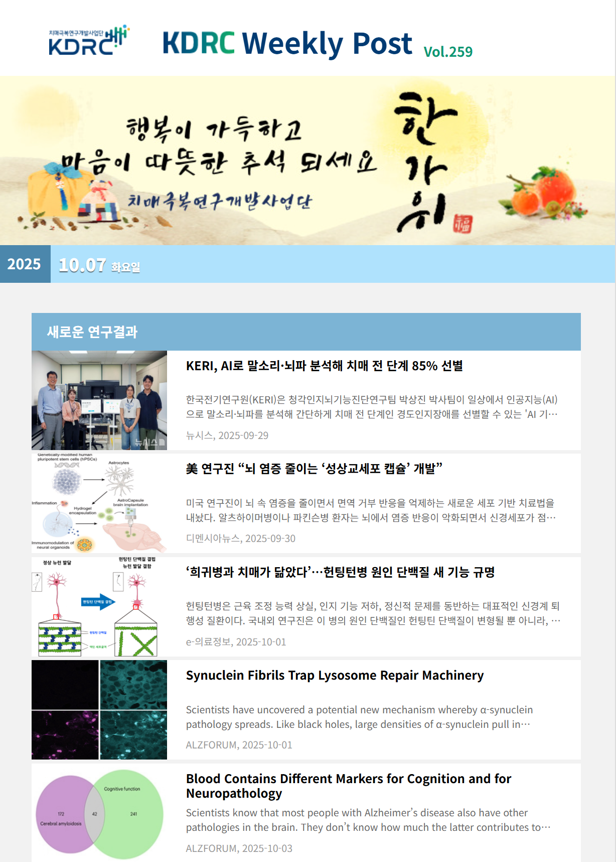 새로운 연구 결과, 과학기술 · 산업, 오피니언, 정책 · 학회 소식의 4개 영역으로 이루어져 있으며 치매극복연구개발사업단과 관련된 다양한 뉴스를 전달해 드립니다.