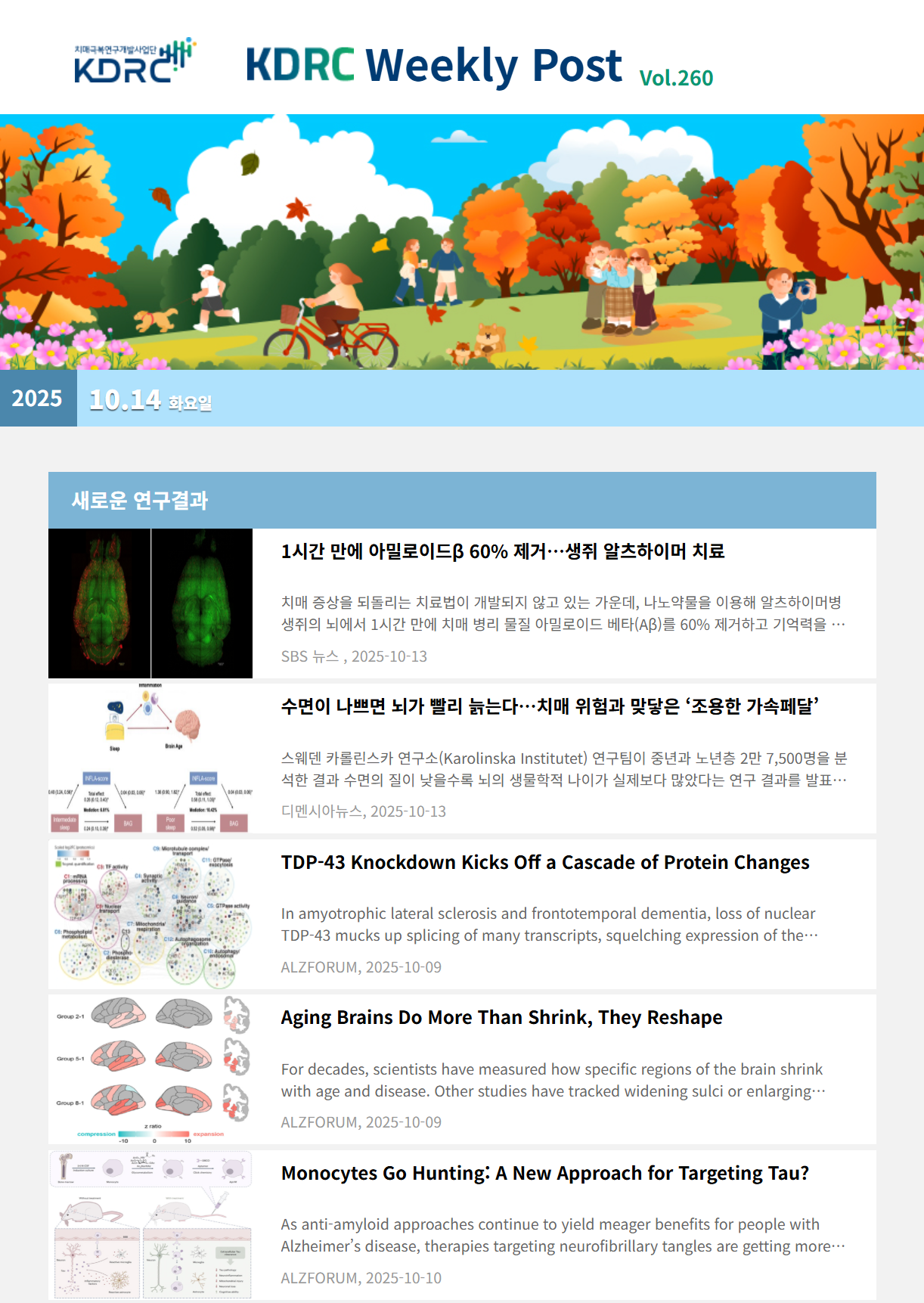 새로운 연구 결과, 과학기술 · 산업, 오피니언, 정책 · 학회 소식의 4개 영역으로 이루어져 있으며 치매극복연구개발사업단과 관련된 다양한 뉴스를 전달해 드립니다.